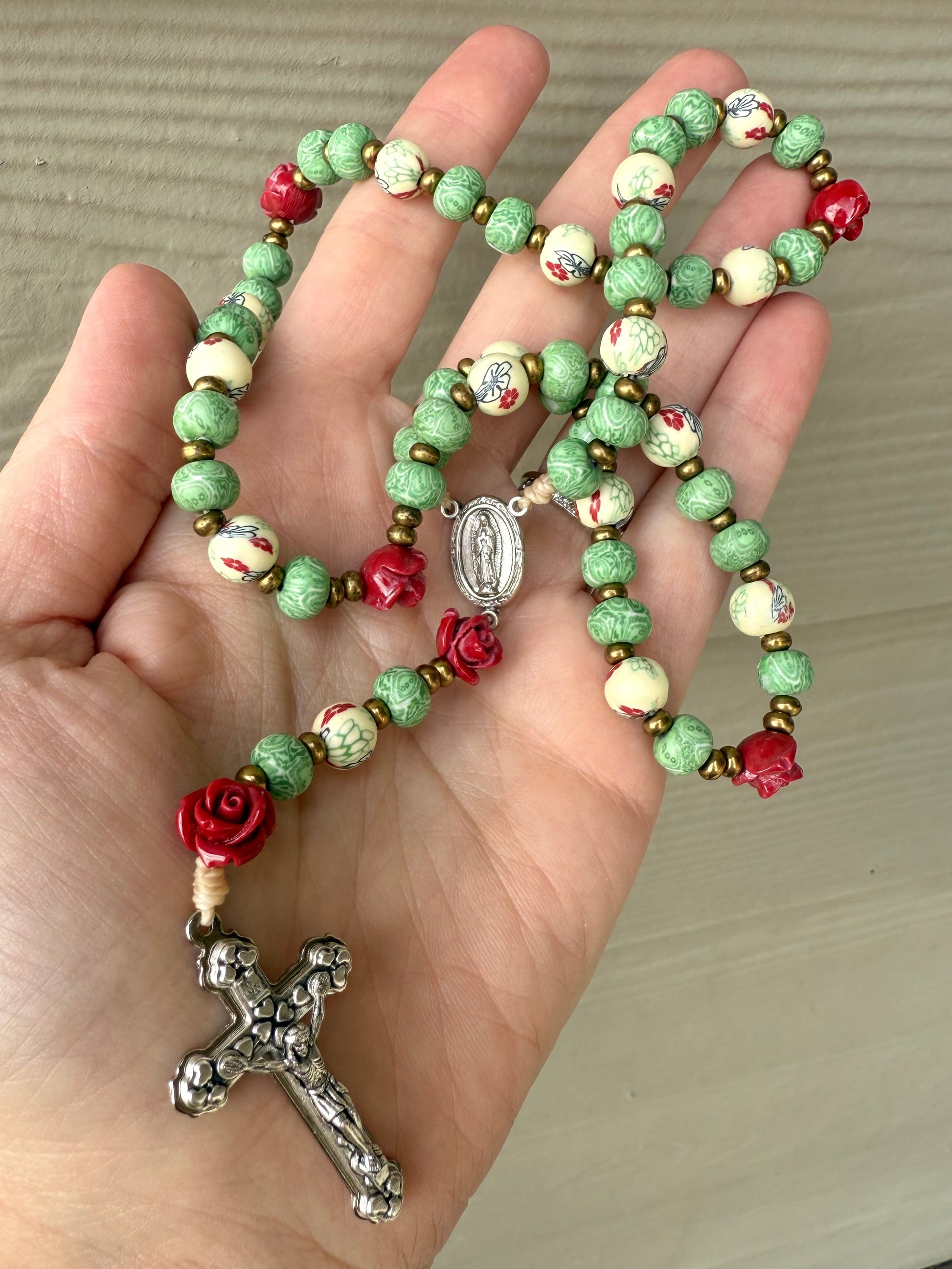 Inspired by the miracle of roses revealed to St. Juan Diego, this rosary captures the warmth, color, and spiritual beauty of Our Lady of Guadalupe in a richly artistic and intentionally rustic design. Every bead, hue, and detail goes together so harmoniously, it feels as if it's existed just like this for all time passed lovingly through generations. Despite the intentional lighter materials, the rosary remains visually rich, detailed, and beautifully crafted.