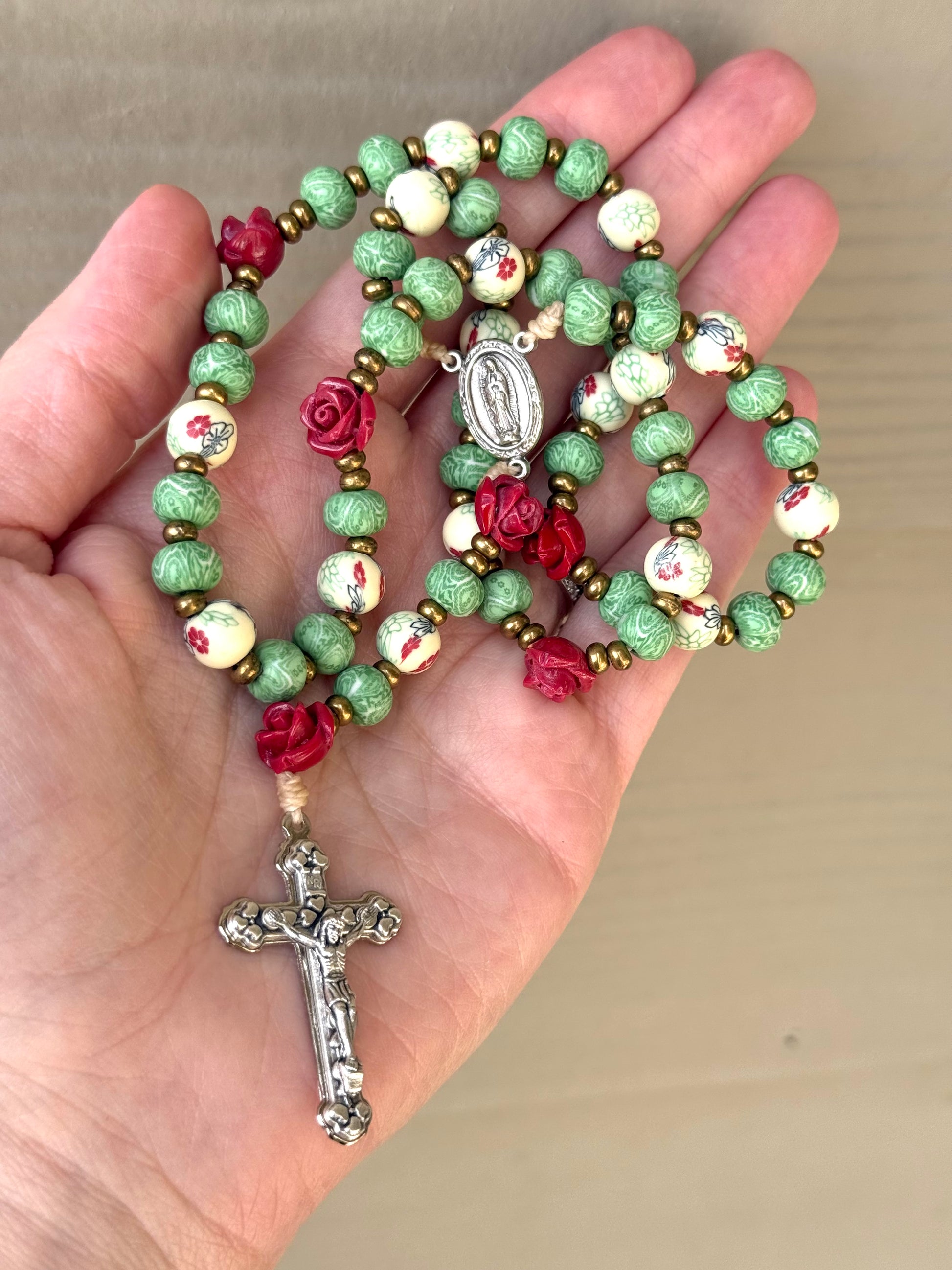 The Miracle of Roses rosary blends rustic artistry with spiritual symbolism—perfect for devotees of Our Lady of Guadalupe or anyone who delights in meaningful, handcrafted beauty.